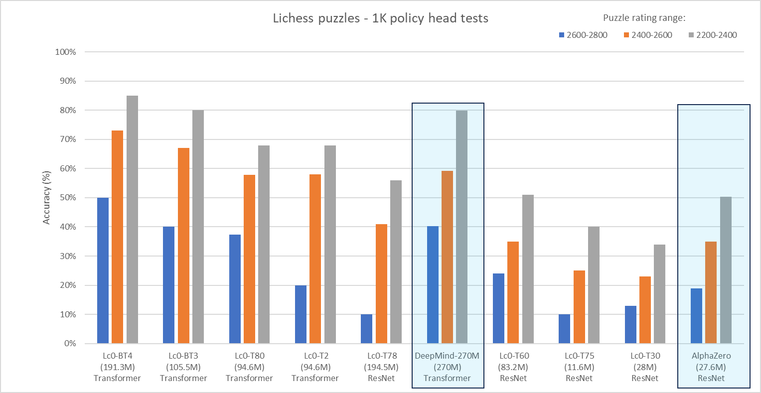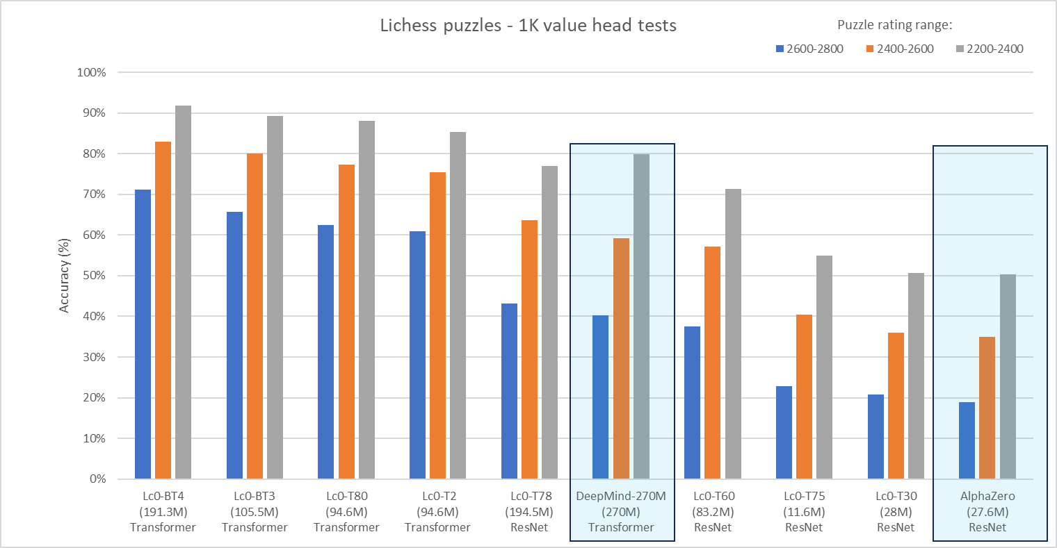 We created a comparison chart that evaluates the value network of various Lc0 networks, AlphaZero, and the latest 270M-parameter network from DeepMind. The data are presented in descending order for the 2600-2800 value puzzle accuracy and the blue boxes indicate the results from the DeepMind paper.